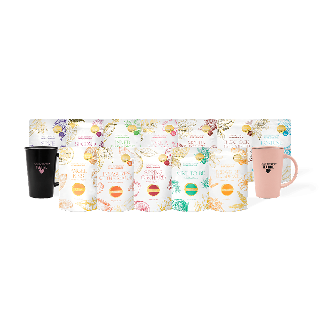 Introducing a lovely gift option for the tea lovers in your life! The GelMoment Tea Gift Set includes 4 full-sized GelMoment Teas of your choice, and a pretty ceramic mug with lid, all packaged in a beautiful gift box with Tea Time sleeve.